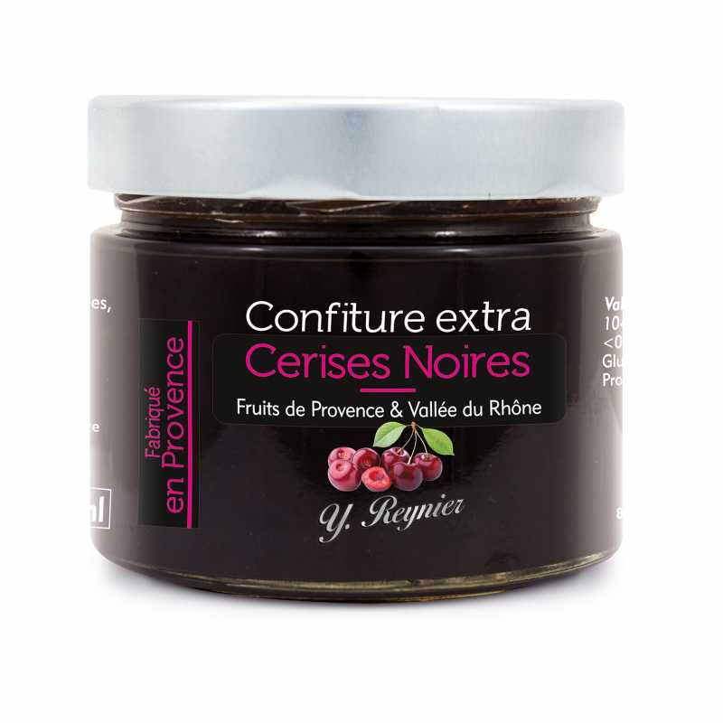 This is a mixture of sugar and fresh, pitted black cherries cooked to the appropriate gelled consistency. “Extra” means that the quantity of fresh fruit used in our jam is a minimum of 450 g per 1000 g of finished product, that is, 45%. Our black cherry jam contains 65% fruit. These jams are prepared with fresh, ripe, and sound fruits that have been washed and trimmed. All defective fruits are eliminated. They are pitted and cooked with premium quality sugar. Ingredients: cherries, sugar, lemon juice, fruit pectin. Allergens: None. Nut values. /100g: Energy KJ/Kcal: 1040/245 Fats: 0.22g Of which AGS: 0.0315g Carbohydrates: 59.9g Of which sugars: 54.5g Proteins: 0.47g Salt: 0.054g