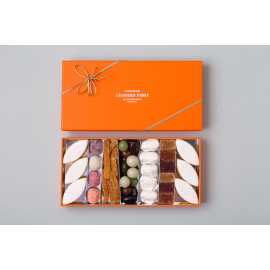 Un cadeau gourmand ! De délicieux Mini Calissons accompagnés de Pâtes de fruits traditionnelles Pâtes de fruit : orange, abricot, framboise, poire, fraise et passion sont une valeur sûre ! Retrouvez les douceurs Léonard Parli, ordonnées tels de véritables bijoux dans leurs coffrets orange. Taille 1 : 270gr Taille 2 : 340gr